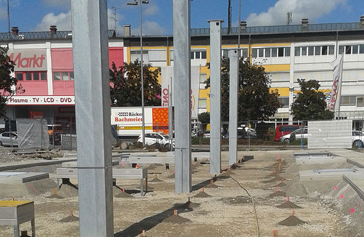 Neubau einer RAN-Tankstelle in Rosenheim, Oberbayern: Die schnelle Bauzeit von 12 Wochen wird über Verwendung von vorgefertigten Shop, Fundamenten und Fertigteilen für die Betankungsfläche erreicht.